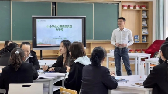 ![Image: Xiao Yi conducting training on identification and intervention of psychological problems for local teachers]