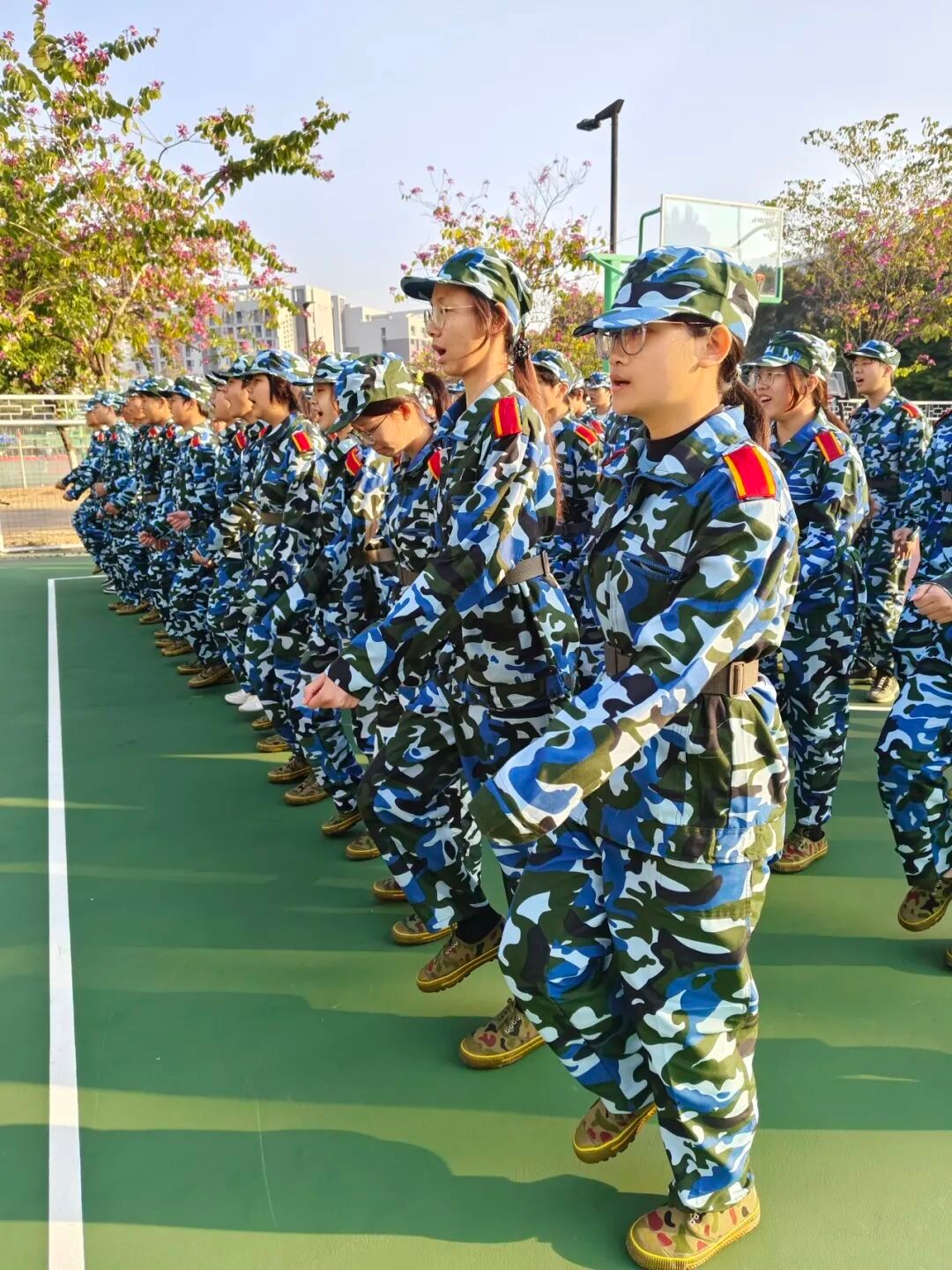 齐步走看着简单,练起来才知不易,摆臂的高度、步幅的大小、落脚的节奏,每一处都要整齐划一。教官一遍遍示范,喊着口令纠正我们的动作,从单独分解练习到整体列队行进,反复的练习让手臂发酸、腿脚发麻,但当队伍的脚步声终于汇成一道整齐的节拍,心中便满是成就感。