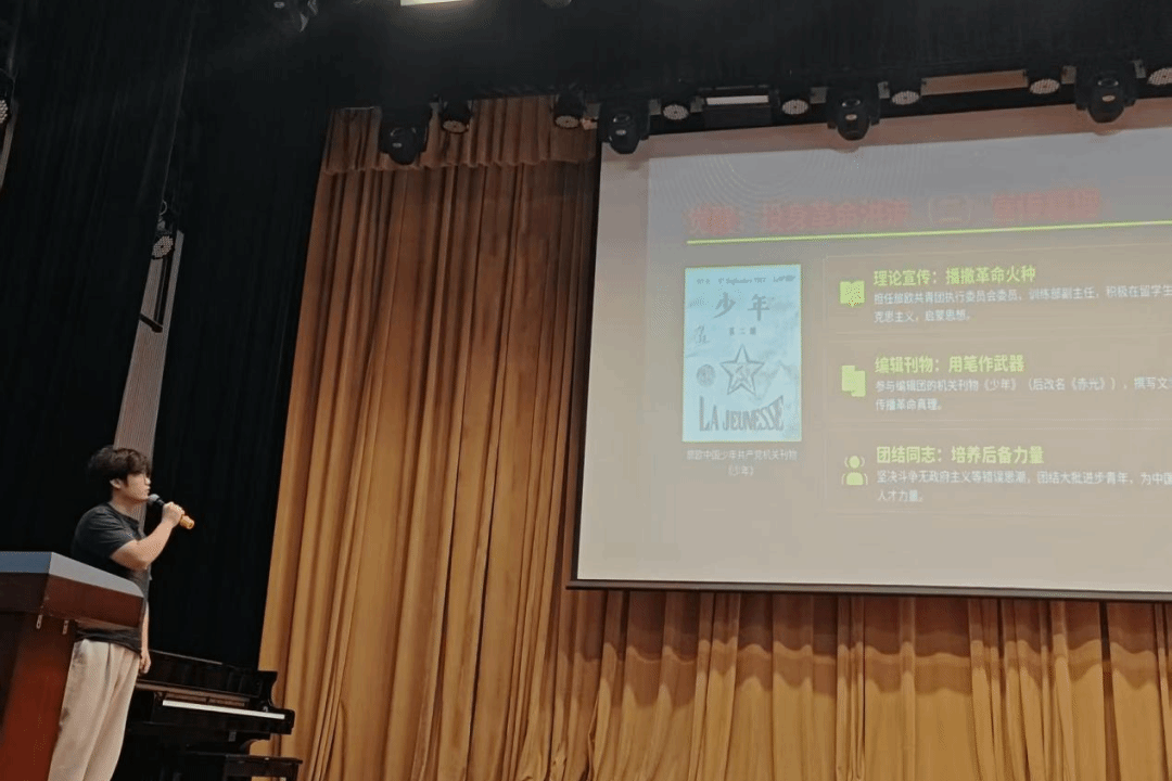 在随后的人物故事汇环节,来自2024级、2025级七个团支部的代表依次登台,深情讲述了周恩来、邓小平、陈毅、聂荣臻、蔡和森、向警予、李富春七位留法勤工俭学历史人物的故事。