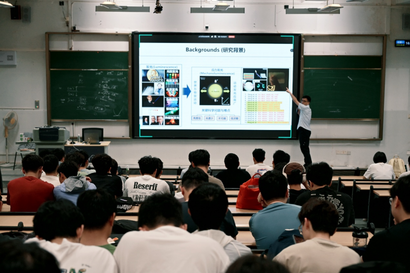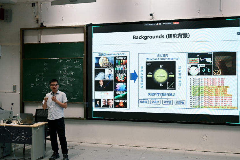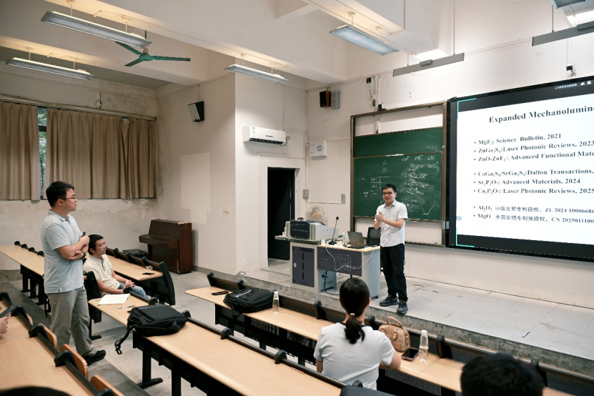 讲座中,彭教授以 “应力发光功能材料与器件开发” 为核心主题,系统拆解了应力发光机理、典型材料体系、传感应用场景及材料制备工艺与性能优化等关键内容,结合行业前沿进展与研究思路,为同学们打开了材料科学研究的全新视野,让大家对功能材料的实际应用价值有了更直观、深入的认知。