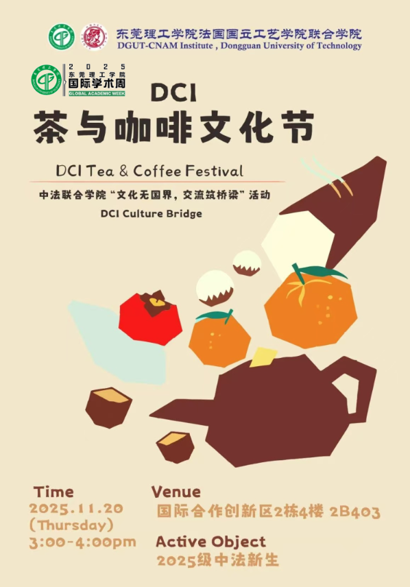 活动内容:第五届 DCI 茶与咖啡文化节,为中法学院国际周添彩!外籍教师与学生代表携书籍、PPT,细说中国茶文化、外国咖啡文化的深厚底蕴。现场可享围炉煮茶之暖,可尝手冲咖啡之醇,可观功夫茶冲泡之雅,更有 “茶与咖啡对话” 沙龙,探讨中外文化与教育差异,聆听学长学姐的赴法见闻。以茶咖为桥,赴一场兼具雅致与深度的跨国交流之约!报名方式:扫描二维码。