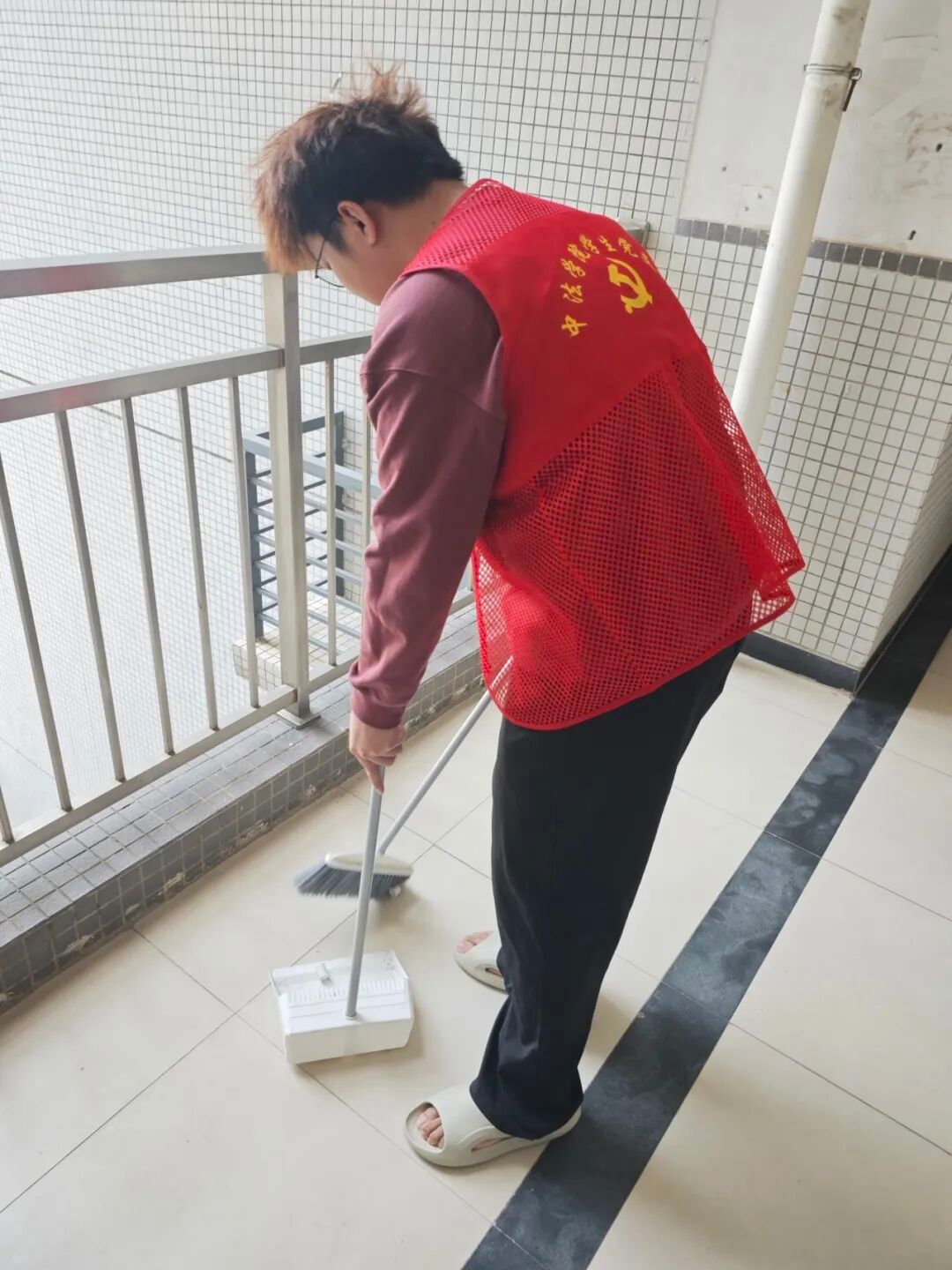 24栋中法学院男生宿舍公共区午后时光,爱国卫生运动志愿服务火热开展,志愿者们以劳动践行雷锋精神,以行动守护美丽校园。大家携带清洁工具,前往指定宿舍楼层,聚焦公共区域卫生难点,对楼道地面、楼梯扶手、墙角角落等进行全面清扫,细致清理地面垃圾、认真整理堆放杂物、耐心擦拭公共设施,不放过任何一处卫生死角,用双手扮靓宿舍环境